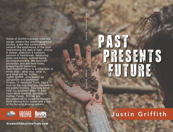 Some of Griffith's poems read like songs, others like autobiographical stories, a few like confessions, several like epiphanies of the soul. Intertwining the dark & light, victory & defeat, addiction & freedom, passion & heartbreak. Balancing deep and brainy, without being incomprehensible. We survived yesterday and are here today, preparing for tomorrow. Past Presents Future is a collection of three eras - what was, what is, and what will be. Author Justin Griffith, also known as songwriter and performer Grades Of Absolute Truth, has a love for hip-hop that you can feel in his poetic metrics. You may even hear his southern drawl in your head while reading, courtesy of Dallas, Texas. Entries are accompanied by powerful imagery - B&W photos from Justin and a few of his favorite photographers.